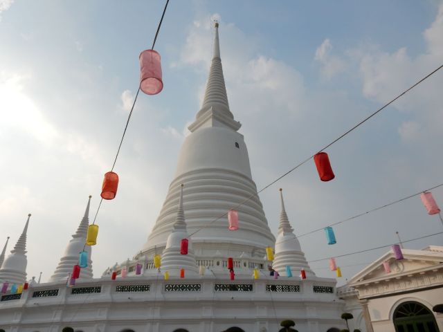 De Thaise hoofdstad Bangkok is met ruim 8 miljoen inwoners de grootste stad van het land. Zeker wanneer je voor het eerst in Azië bent, kan deze stad nogal overweldigend zijn. Wij besloten de eerste volle dag dan ook rustig aan te doen. We aten bij een Pad Thai restaurant om de hoek van ons hotel en maakten kennis met de heerlijke Thaise keuken. Ondertussen heb ik meer foto’s van eten dan van andere dingen, dus daar moet ik nog maar een aparte blog voor maken. We reden vervolgens in 10 minuten met een taxi richting het koninklijk paleis, omdat dit mooi scheen te zijn. We hadden ons alleen niet goed ingelezen en het paleis bleek al snel dicht te gaan. Een vriendelijke meneer sprak ons direct aan en liet ons op onze eigen kaart van Bangkok verschillende andere plekken zien die we konden bezoeken. Na drie keer “Don’t worry, I don’t want money and I don’t go with you” hield hij een tuktuk aan die ons voor 60 baht (= 1.60 euro) naar al die plekken zou rijden. We vonden het een prima deal en stapten in. Zonder enig idee naar welke plekken hij ons zou rijden, kwamen we langs een tempel waar een crematiedienst bezig was en een pakkenwinkel waar Vladimir met al zijn wilskracht een Armani pak moest afwijzen (“You only live once sir, buy the suit… Lady, buy your man a suit!”). Ook reden we langs een tempel, de Wat Intharawihan, waar een 32 meter hoog, gouden boeddha beeld op ons neerkeek. Vervolgens wilden we zelf naar een oud fort aan de rivier, de Chao Praya, en wezen we op de kaart aan waar dat was. De tuktuk chauffeur sprak geen Engels en leek het niet helemaal te begrijpen. Vervolgens zette hij ons vlakbij de rivier af, maar moesten we nog vijf minuten lopen. Toen we na een half uur terug kwamen, bleek onze chauffeur verdwenen. We hebben nog drie rondjes gelopen, maar hij was nergens te bekennen. Die 60 baht hebben we ’s avonds uitgegeven op de Khao San straat, een bekende straat in een leuk uitgaansgebied. De gegrilde krokodil bij het straatkraampje ‘Bangcroc‘ sloegen we wel over…