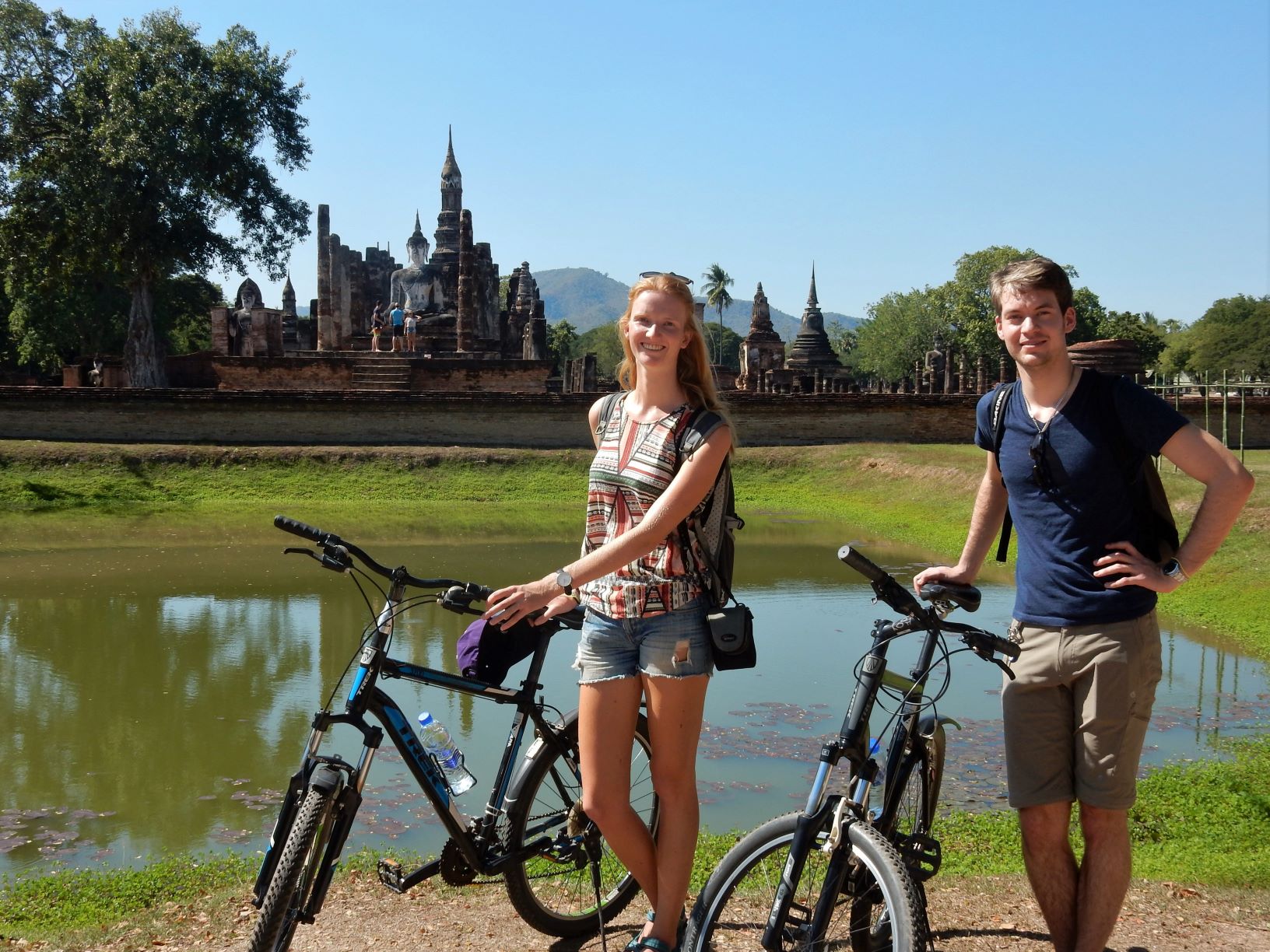 De volgende dag werden we om 8.15 bij ons hotel opgehaald en reden we naar het oude centrum van Sukhothai. We kwamen aan bij het huis van Miaow, onze gids voor vandaag. Via Sukhothai Bicycle Tour hadden we een dagtour geboekt en we hadden het geluk de enige gasten te zijn. Van half 9 ’s ochtends tot half 5 ’s avonds hebben we door de omgeving en het historische tempelpark van Sukhothai gefietst. Het was er gelukkig erg rustig, waardoor we sommige tempels voor onszelf alleen hadden. Deze tour is 100% een aanrader! Miaow wist niet alleen veel te vertellen over de geschiedenis van de tempels en Thailand, maar ook over het huidige leven van de inwoners. Zo legde ze het verschil tussen de verschillende tempels uit, hoe de mensen aan schoon drinkwater komen, hoe ze werken en wat lokale gerechten zijn. Ook fietsten we langs de groenste rijstvelden die ik tot nu toe heb gezien. Aan het einde van de dag ruilden we onze kruidnootjes (heb ik ze toch nog gegeten dit jaar!) voor paprika-bananenchips. De tempels van Angkor Wat waren mooi en waarschijnlijk bekender, maar deze tempels doen daar niet voor onder…